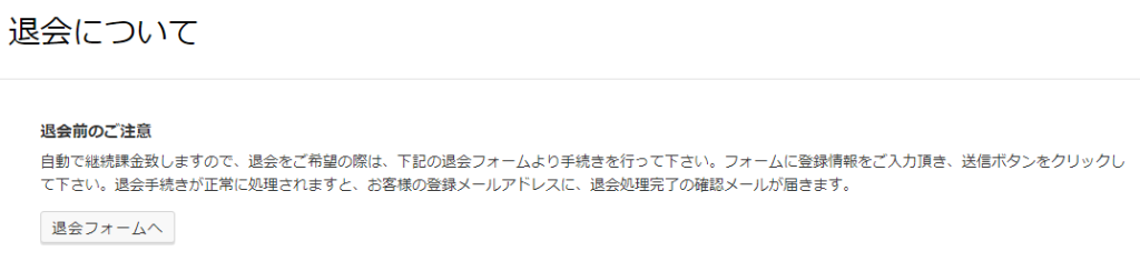 | 退会方法 | 契約は自動更新のため、退会したい場合には公式ホームページ退会フォームから、退会処理を行います。 |