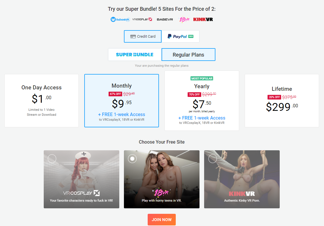 プランの選択が終わったら(※月間会員と年会会員はプランの選択後に無料で加入できる系列サイトをひとつ選びます。)画面下の「JOIN NOW」をクリックします。
