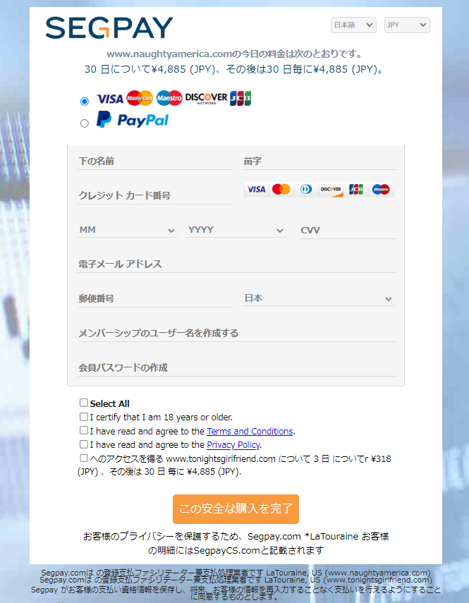 Naughty America VRのクレジット決済代行会社は「SEGPAY」で日本語対応なので安心です。