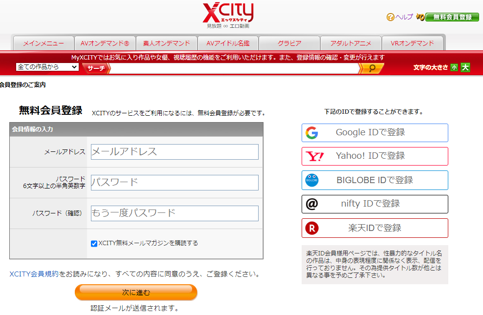 XCITYユーザー登録ページにて、メールアドレスとパスワードを入力すれば無料会員登録でき、即日利用可能です。